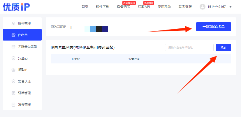 可在【个人中心】-白名单页面点击【去添加白名单>】按钮进行设置。